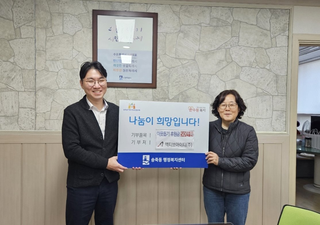 최선정 송죽동장은 “매년 잊지 않고 따뜻한 나눔을 실천해 주시는 ㈜ 엑티브아이티에 깊이 감사드린다 ”며 “기탁해 주신 후원금은 도움이 꼭 필요한 이웃들에게 소중히 전달하겠다 ”고 전했다.