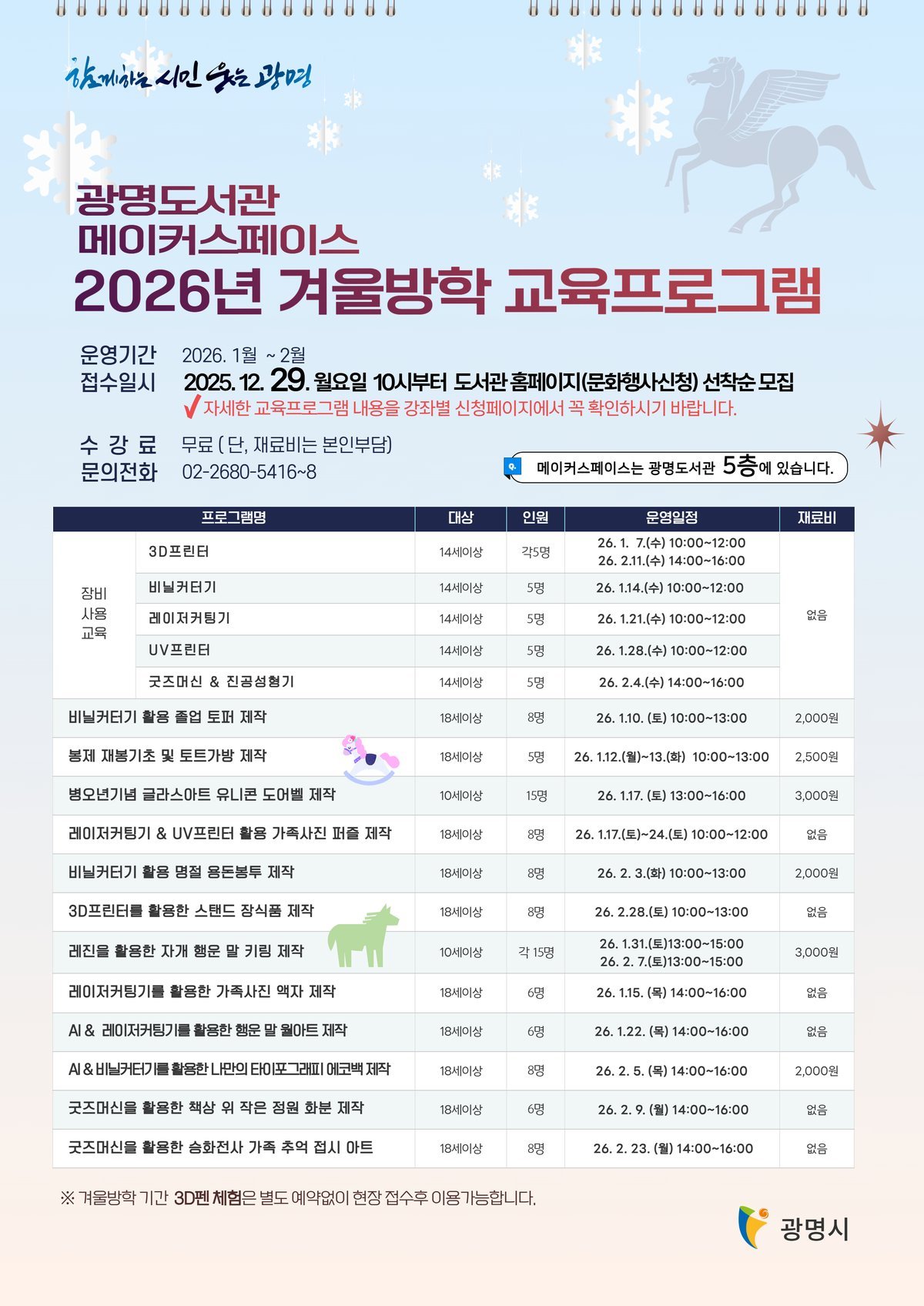 [금요저널] 광명시 광명도서관은 오는 29일부터 ‘메이커스페이스 2026년 겨울방학 교육 프로그램’참가자를 모집한다.