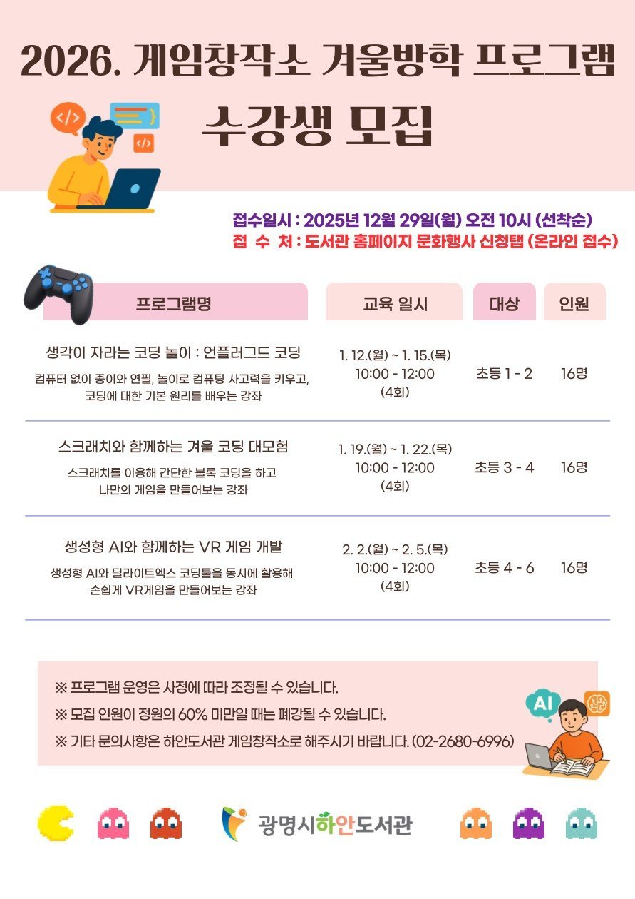 교육과정은 2026년 1월 12일부터 2월 5일까지 운영하며, △‘생각이 자라는 코딩놀이: 언플러그드 코딩’△‘스크래치와 함께하는 겨울 코딩 대모험’△‘생성형 AI와 함께하는 VR 게임 개발’등 총 3개 과정으로 진행한다.