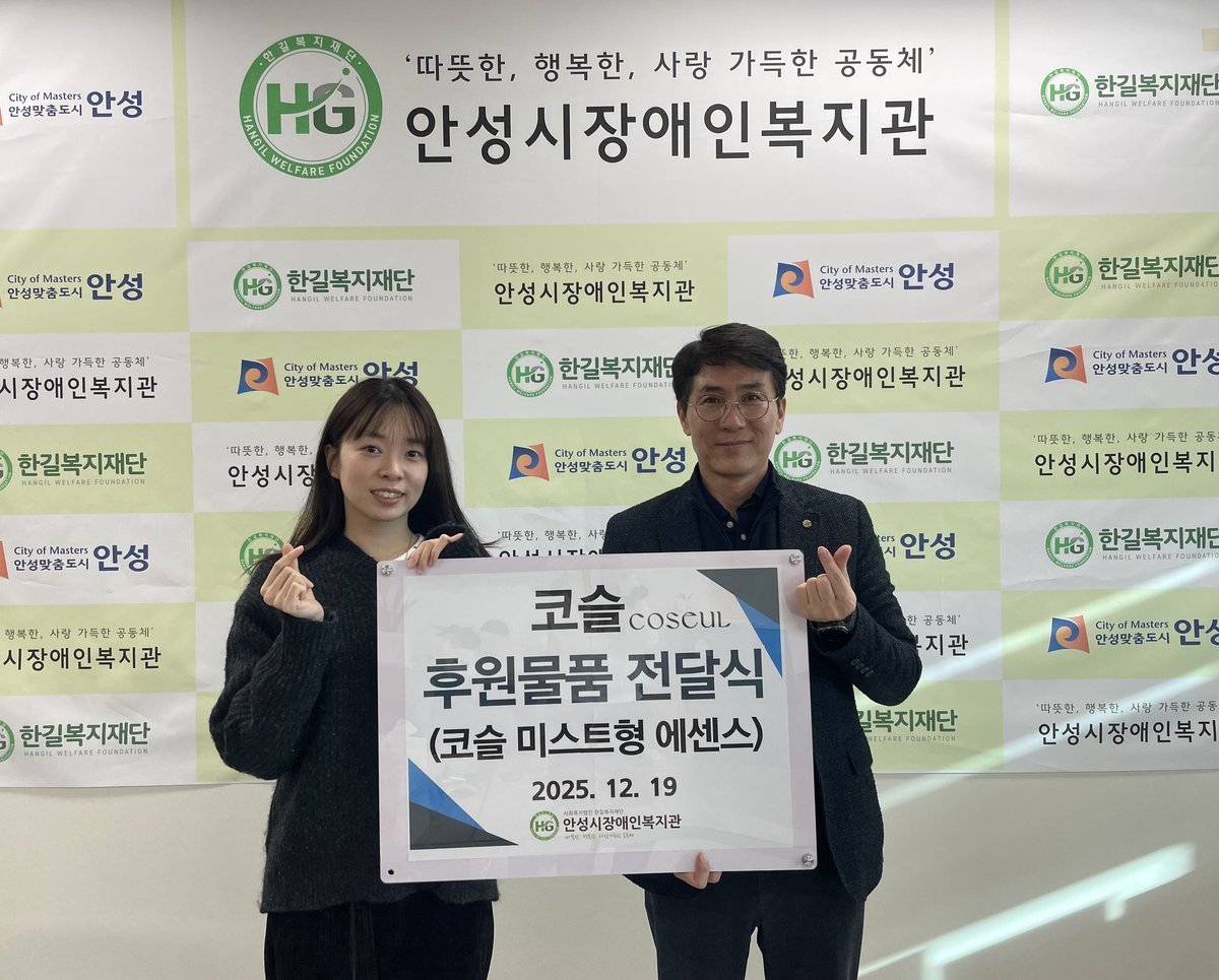 [금요저널] 사회복지법인 한길복지재단에서 수탁하고 있는 안성시장애인복지관은 지난 12월 16일, 코스메틱 브랜드 코슬로부터 미스트형 에센스 50개를 기부받았다고 밝혔다.