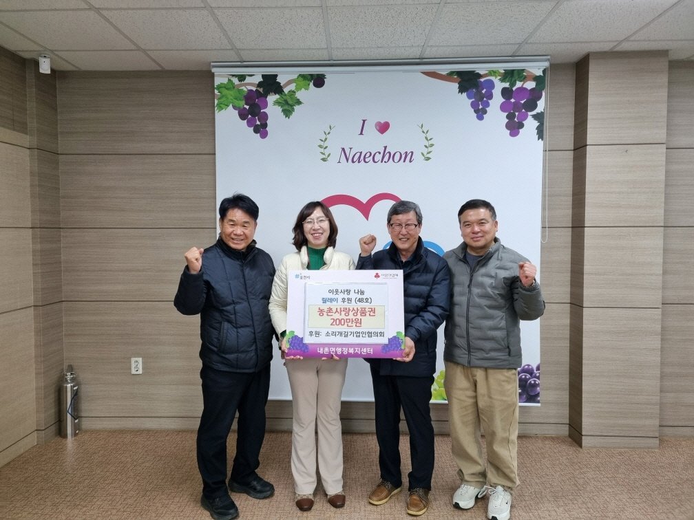 [금요저널] 포천시 내촌면 행정복지센터는 지난 24일 소리개길기업인협의회가 농촌사랑상품권 200만 원 상당을 경기 사회복지공동모금회에 기탁하며 ‘이웃사랑 나눔 릴레이 48호’에 동참했다고 밝혔다.