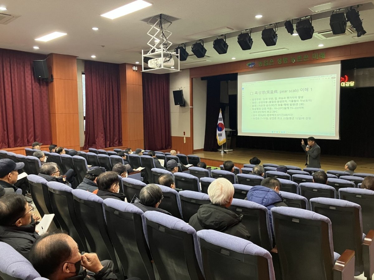 이어 김병준 팀장은 ‘배나무 살균제 활용기술’을 주제로 △예방·치료 살균제의 적기 처리 방법 △검은별무늬병 군별 약제 정리 △2026년 배 과원 실천 기술 △전정·시비의 균형 관리 등 현장 적용 중심의 내용을 상세히 설명했다.