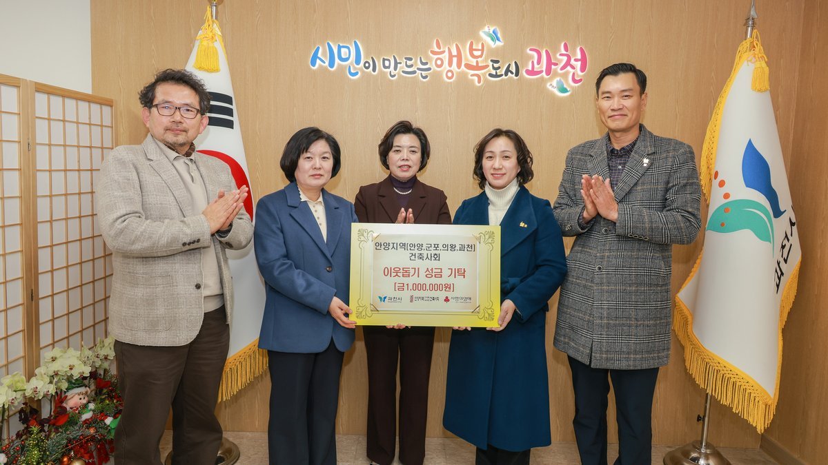 성금 전달식은 이날 시청 시장 집무실에서 열렸으며, 신계용 과천시장과 안양지역 건축사회 김재정 회장, 관계자들이 참석했다.