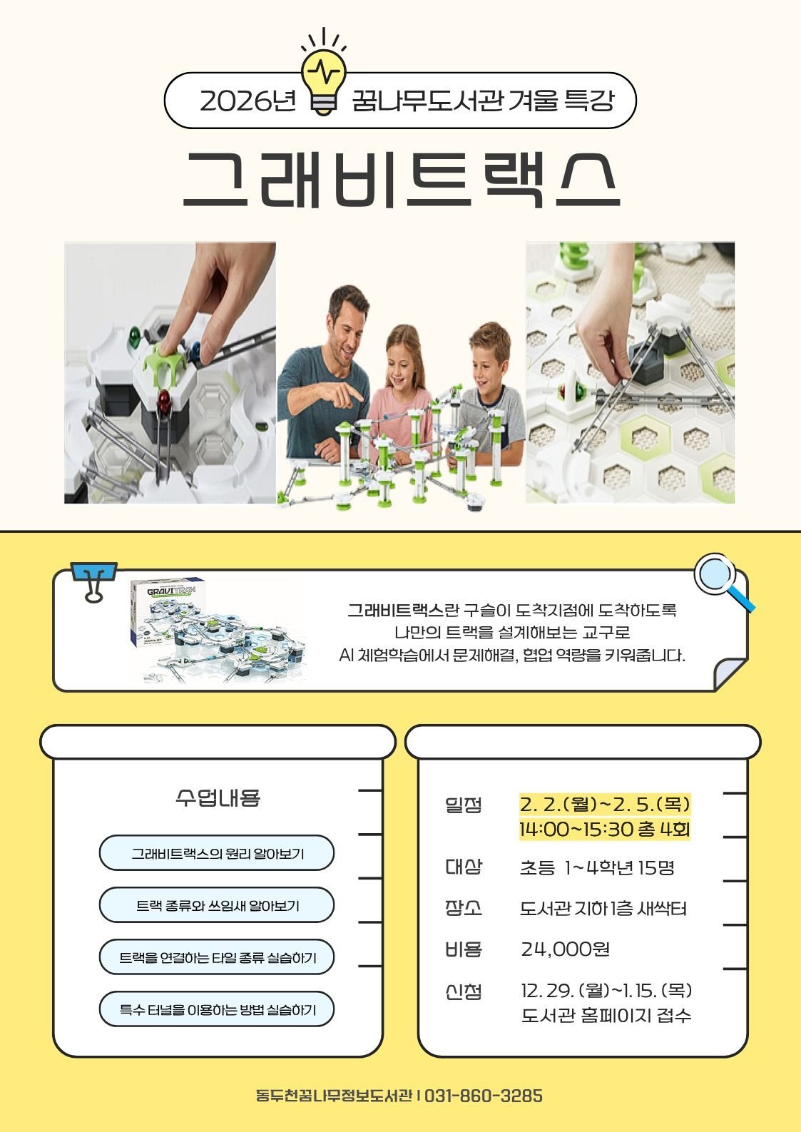 이어 2월 2일부터 5일까지는 ‘그래비트랙스로 재미있게 과학 배우기’수업을 15명 대상으로 오후 2시부터 오후 3시 30분까지 운영한다.