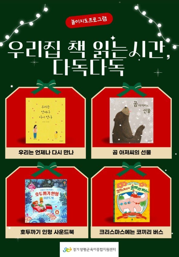 또한 놀이지도 프로그램 ‘우리 집 책 읽는 시간, 다독다독’을 통해 크리스마스 연계 도서 4종 중 1권을 제공하고, 독서 활동과 연계한 놀이 방법을 안내해 가정 내 독서 활동을 지원했다.