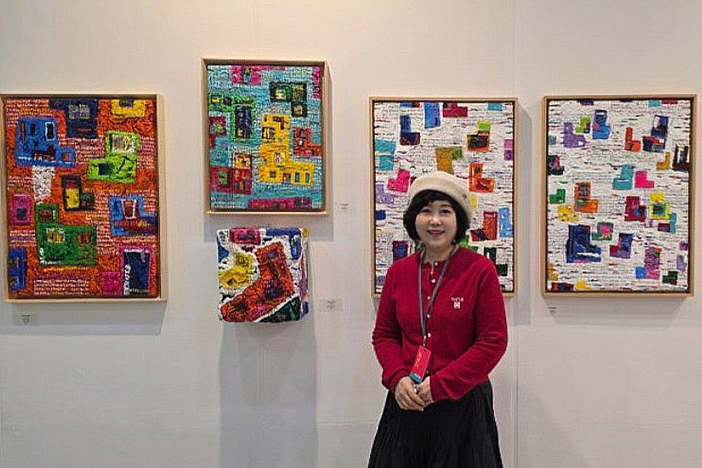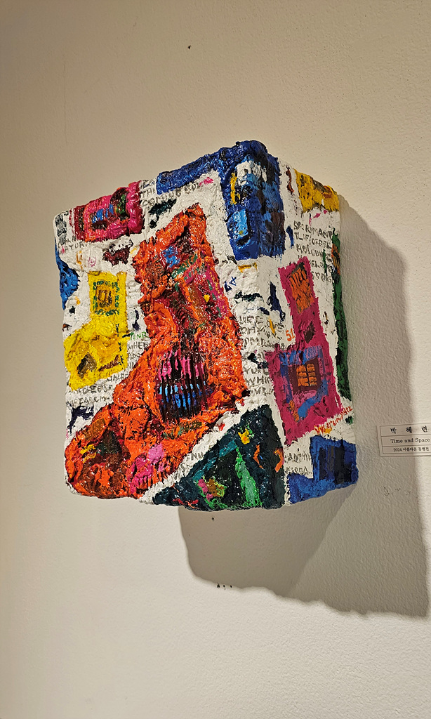 전시 된 작가의 'Time and Space' 작품은 생각 속에 숨겨진 의식과 사상을 겉으로 표현하는 방식을 통해 미술작품으로 탄생 되었다. 일정한 규격에 맞추듯 생성된 이미지는 추상에 가까운 자유로운 상상력이 동원되었으며, 다채로운 채색은 전달력을 높이는 도구가 된다. 두터운 마티에르 위에 숨겨진 보물처럼 새겨 넣은 문자의 긍정적 구성은 창의성을 돋보이게 한다.