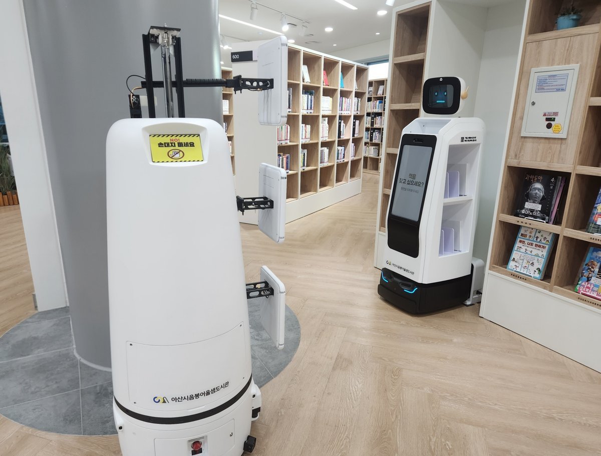 아산시 음봉어울샘도서관은 장서 점검 로봇과 대출·반납 종합 로봇을 실시간으로 연결하는 '이기종 로봇 연계형 스마트 도서관 시스템'을 신규 도입했다.