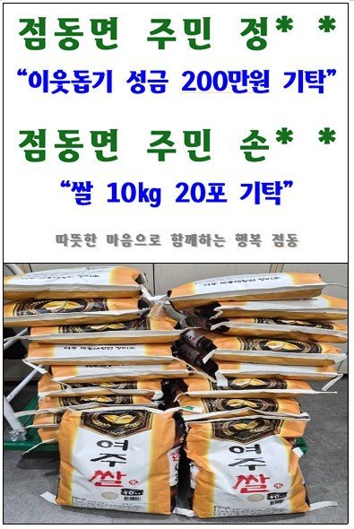 이와 함께 점동면 주민 정** 씨가 어려운 이웃을 위해 성금 200만원을 기탁했으며, 주민 손** 씨 역시 정성과 온기를 담은 쌀 10kg 20포를 전달했다.