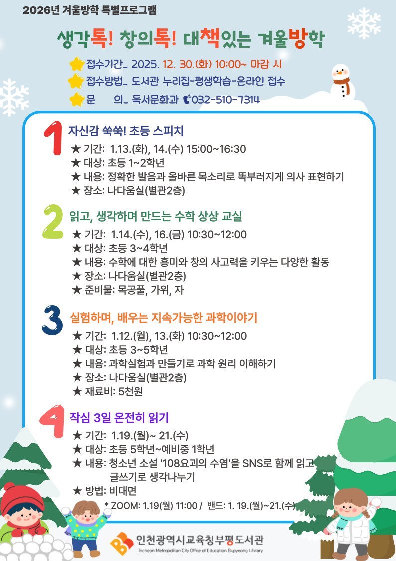 [금요저널] 인천광역시교육청부평도서관은 겨울방학을 맞아 1월 한달간 새 학년을 준비하는 초등학생과 중학생을 대상으로 겨울방학 특별프로그램을 운영한다.