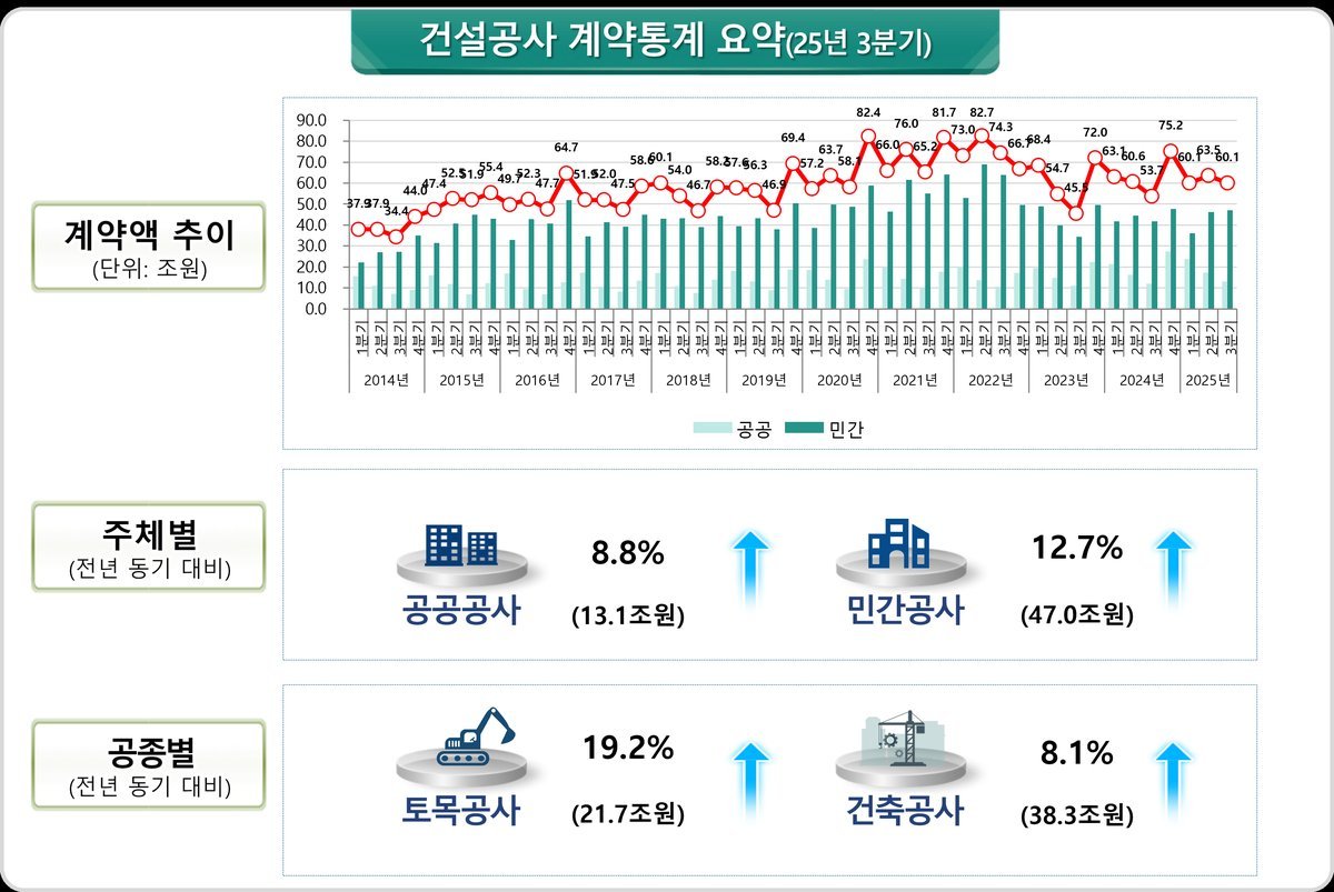[금요저널] 국토교통부는 ’25년 3분기 건설공사 계약액이 전년 동기 대비 11.9% 증가한 60.1조 원을 기록하였다고 밝혔다.