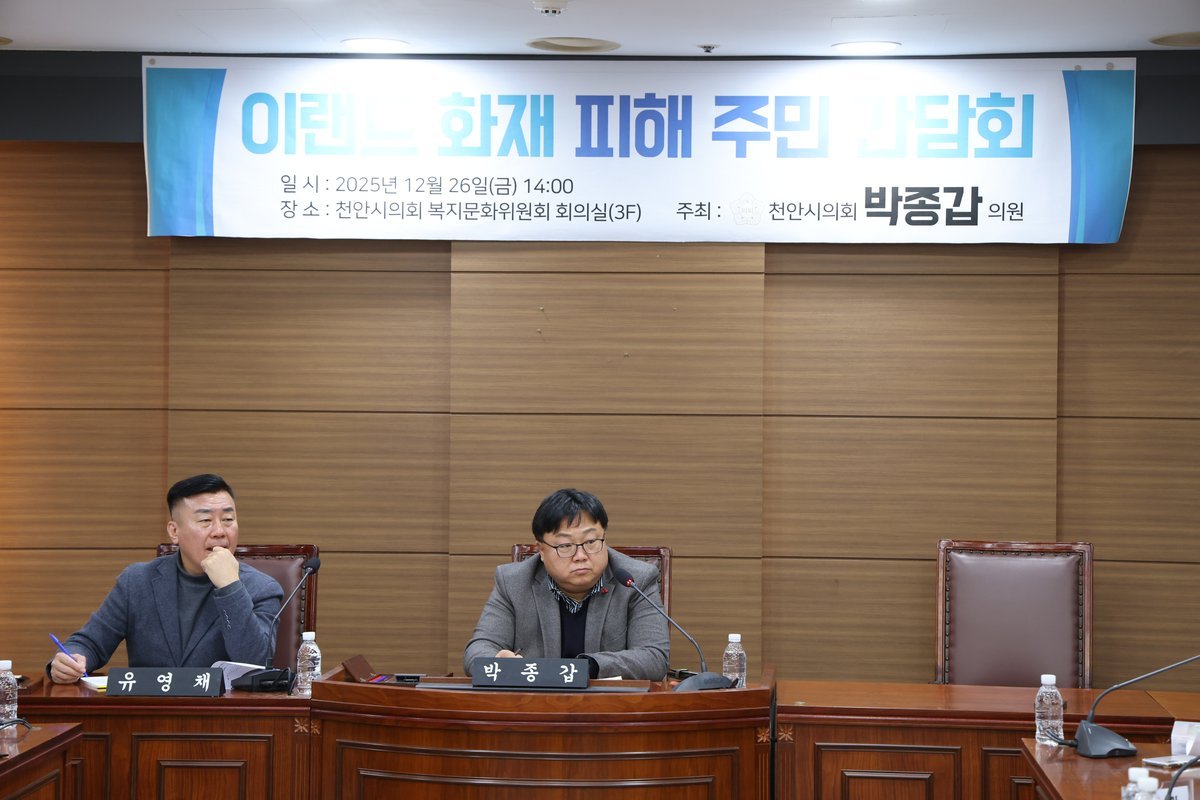 [금요저널] 천안시의회 박종갑 의원은 12월 26일 2시, 천안시의회 복지문화위원회 회의실에서 ‘이랜드 화재 피해 주민 간담회’를 열고, 풍세 지역 주민들의 피해 호소를 직접 청취했다.