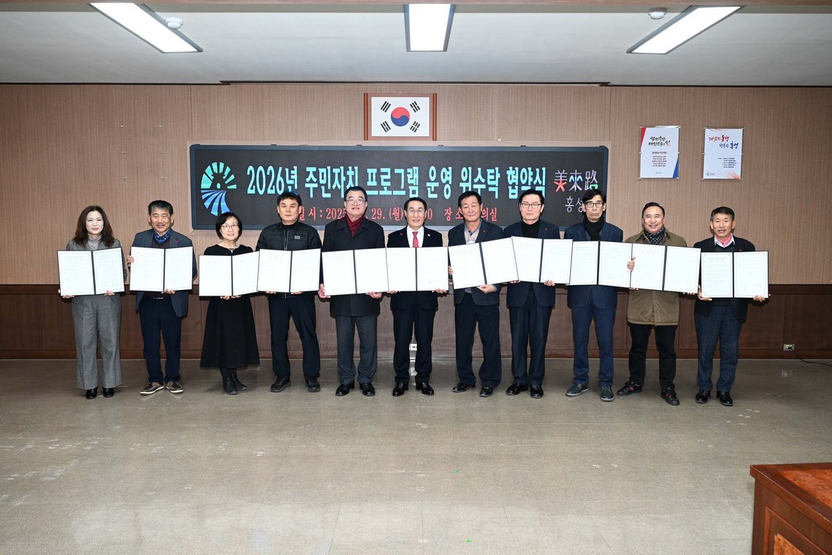 [금요저널] 홍성군은 지난 29일 군청 회의실에서 김노성 홍성군주민자치협의회장을 비롯한 11개 읍‧면 주민자치회장이 참석한 가운데 ‘2026년 주민자치센터 프로그램 운영 위‧수탁 협약식’을 개최했다.