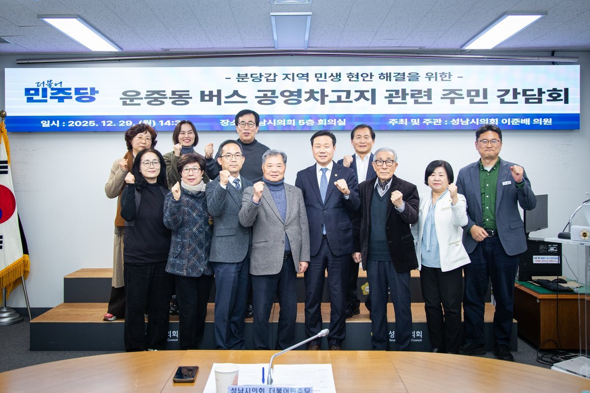 [금요저널] 성남시의회 더불어민주당 대표의원 이준배 의원은 29일 성남시의회 5층 회의실에서 ‘운중동 버스 공영차고지 관련 주민 간담회’를 개최했다.