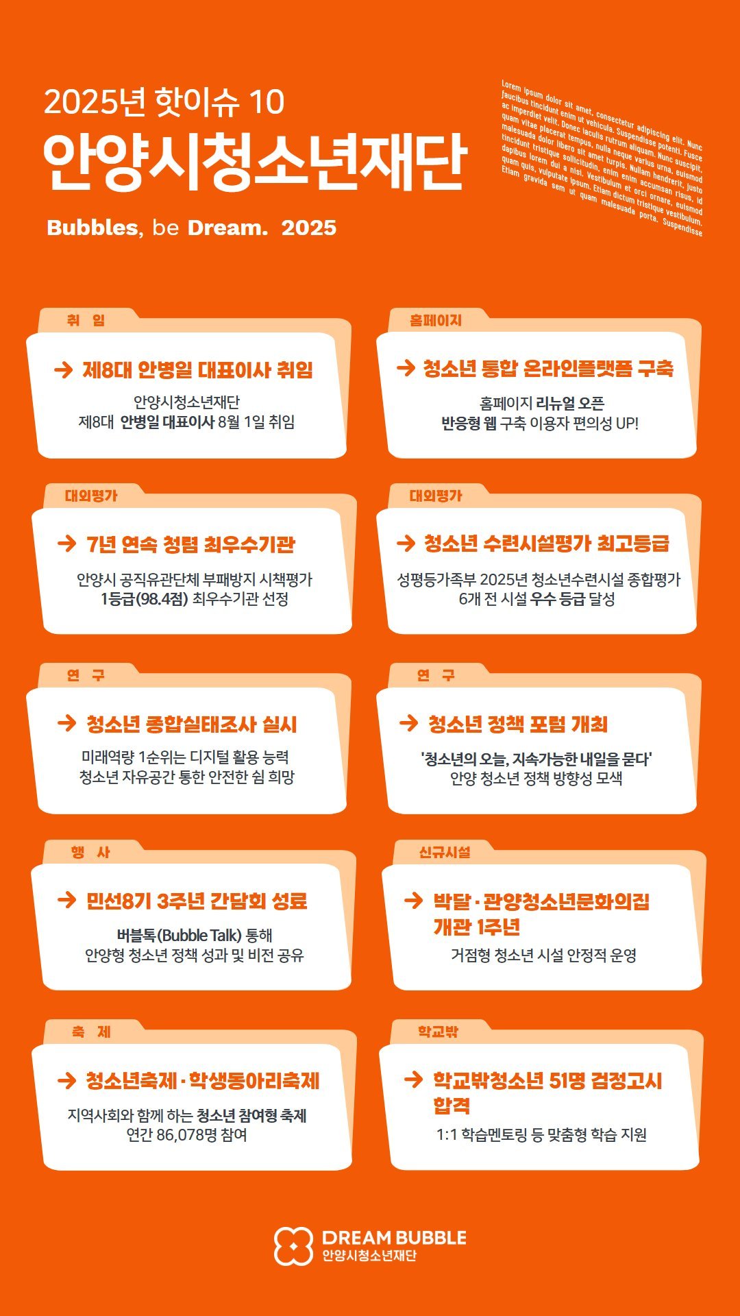 재단은 제 8 대 안병일 대표이사 취임을 계기로 조직 운영의 안정성과 정책 추진력을 한층 강화했으며, 청소년 정책·연구·시설 운영·참여 확대 등 전 분야에서 의미 있는 성과를 거뒀다.