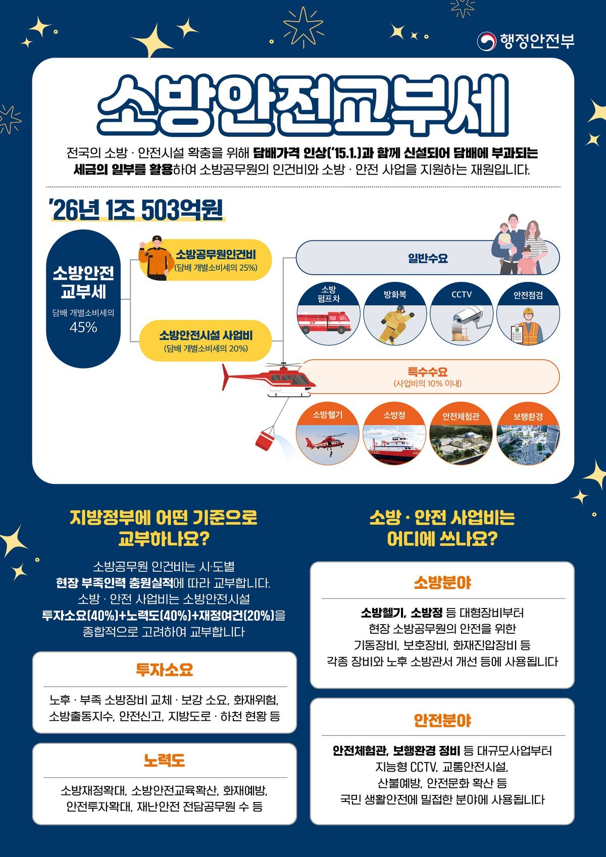 [금요저널] 행정안전부는 지방정부의 소방 및 안전시설 확충 등을 지원하기 위해 2026년도 소방안전교부세* 1조 503억 원을 17개 시·도에 교부한다고 밝혔다.