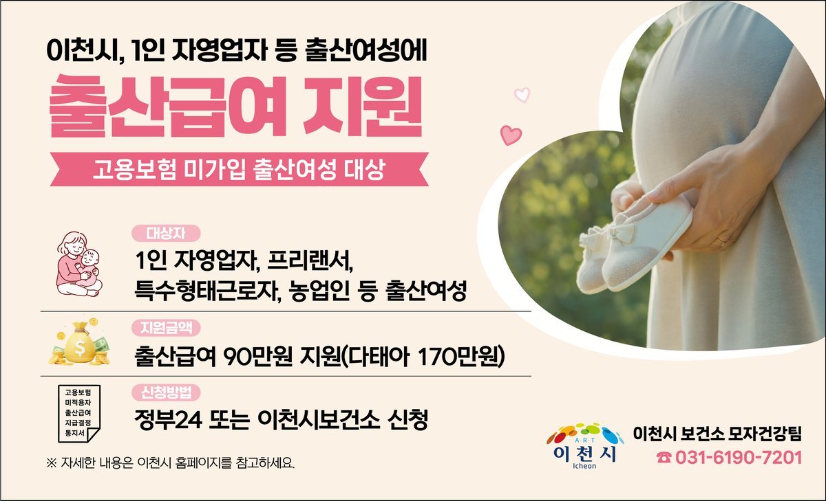 [금요저널] 이천시가 2026년부터 경기도 최초로, 고용보험 가입 대상이 되지 않아 출산휴가급여를 받지 못하는 1인 자영업자, 프리랜서, 특수형태근로자, 농업인 등 출산여성을 대상으로 출산급여를 지원하는‘1인 자영업자 등 출산급여 지원사업’을 새롭게 시행한다.