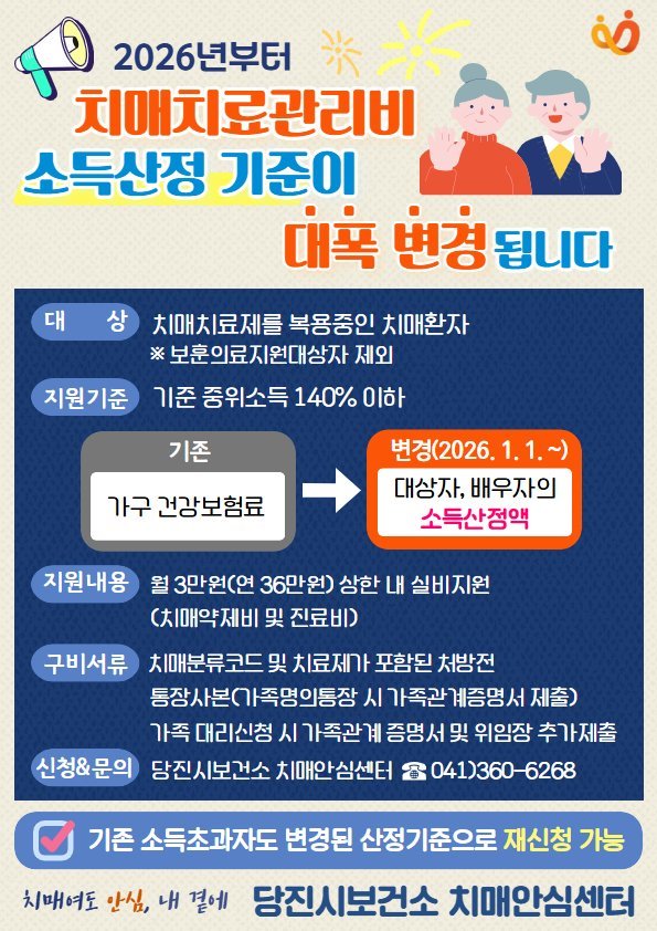 [금요저널] 당진시보건소 치매안심센터는 2026년 1월 1일부터 치매치료관리비 지원사업의 소득 기준 산정 방법이 변경된다고 31일 밝혔다.