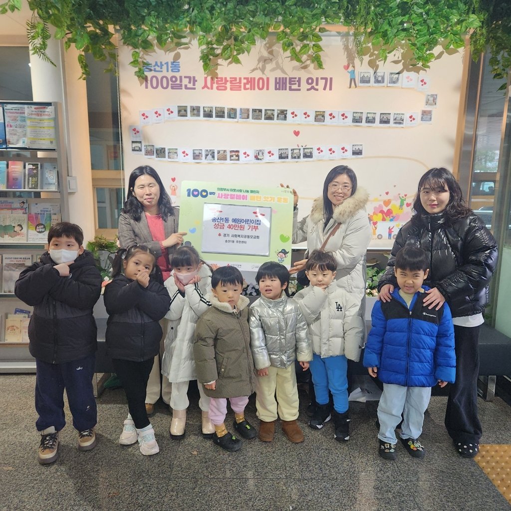 [금요저널] 의정부시 송산1동주민센터는 12월 23일 용현동 소재 예원어린이집이 어려운 이웃을 돕기 위해 성금 40만 원을 기부하며 ‘100일간 사랑릴레이 배턴 잇기’에 동참했다고 밝혔다.