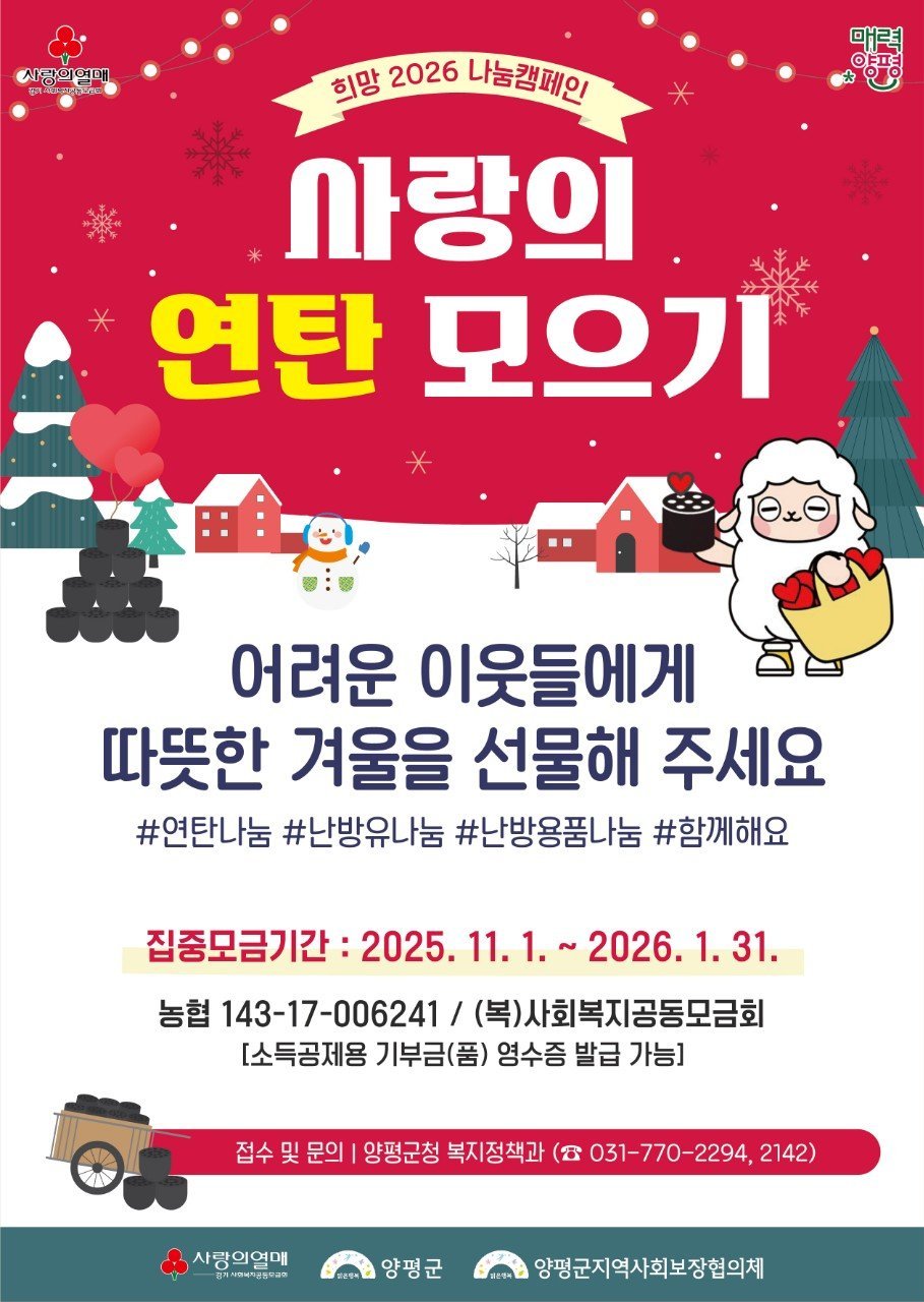 한편 ‘사랑의 연탄모으기 운동’은 난방비 부담으로 어려움을 겪는 저소득층을 대상으로 연탄, 난방유, 난방용품 등을 지원하는 사업이다.