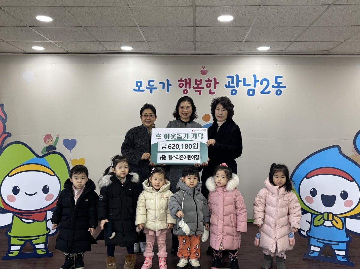 이에 대해 정경아·유숙 광남2동 지보체 공동위원장은 “연말을 맞아 따뜻한 나눔을 실천해 주신 힐스라온어린이집에 깊이 감사드린다”며 “기탁된 성금은 도움이 필요한 이웃들에게 소중히 전달하겠다”고 밝혔다.
