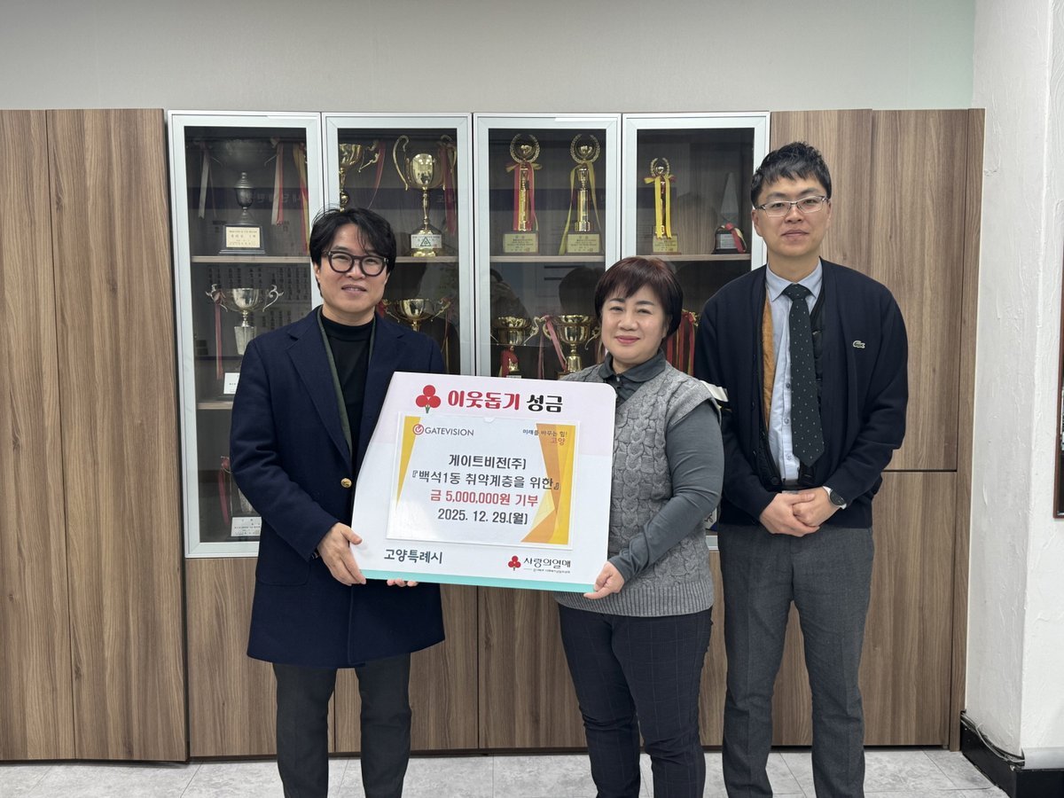 오미근 백석1동장은 “어려운 경제 여건 속에서도 이웃을 위한 나눔에 동참해 주신 게이트비젼㈜ 임직원 여러분께 깊이 감사드린다”며 “소중한 성금이 꼭 필요한 분들께 잘 전달될 수 있도록 최선을 다하겠다”라고 말했다.