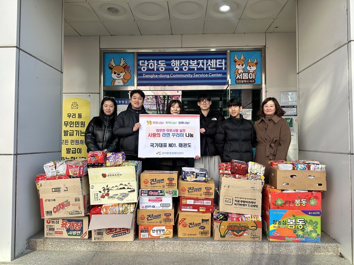 [금요저널] 인천 서구 백석동 소재 국가대표 NO1.태권도는 지난 2025년 12월 31일 관내 소외계층에 전달해 달라며 이웃돕기 사랑의 라면 꾸러미를 당하동 지역사회보장협의체에 전달하였다.