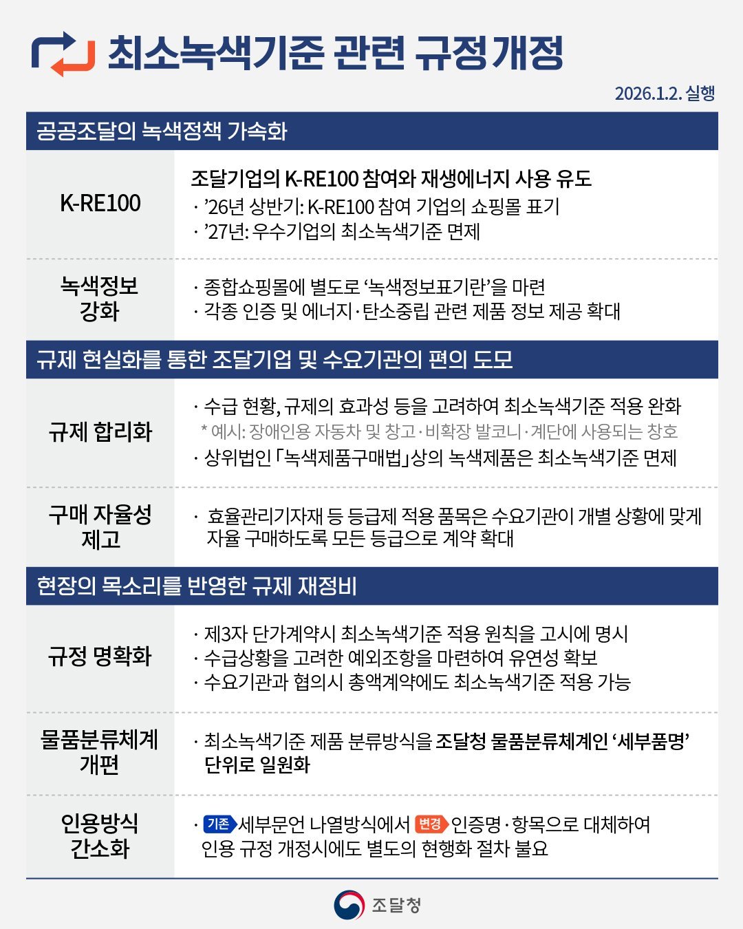 [금요저널] 조달청은 녹색제품의 공공구매를 확대하기 위해 「녹색제품의 공공구매 촉진을 위한 구매요령」과 「공공조달 최소녹색기준 제품」을 개정하고, 1월 2일부터 시행한다.