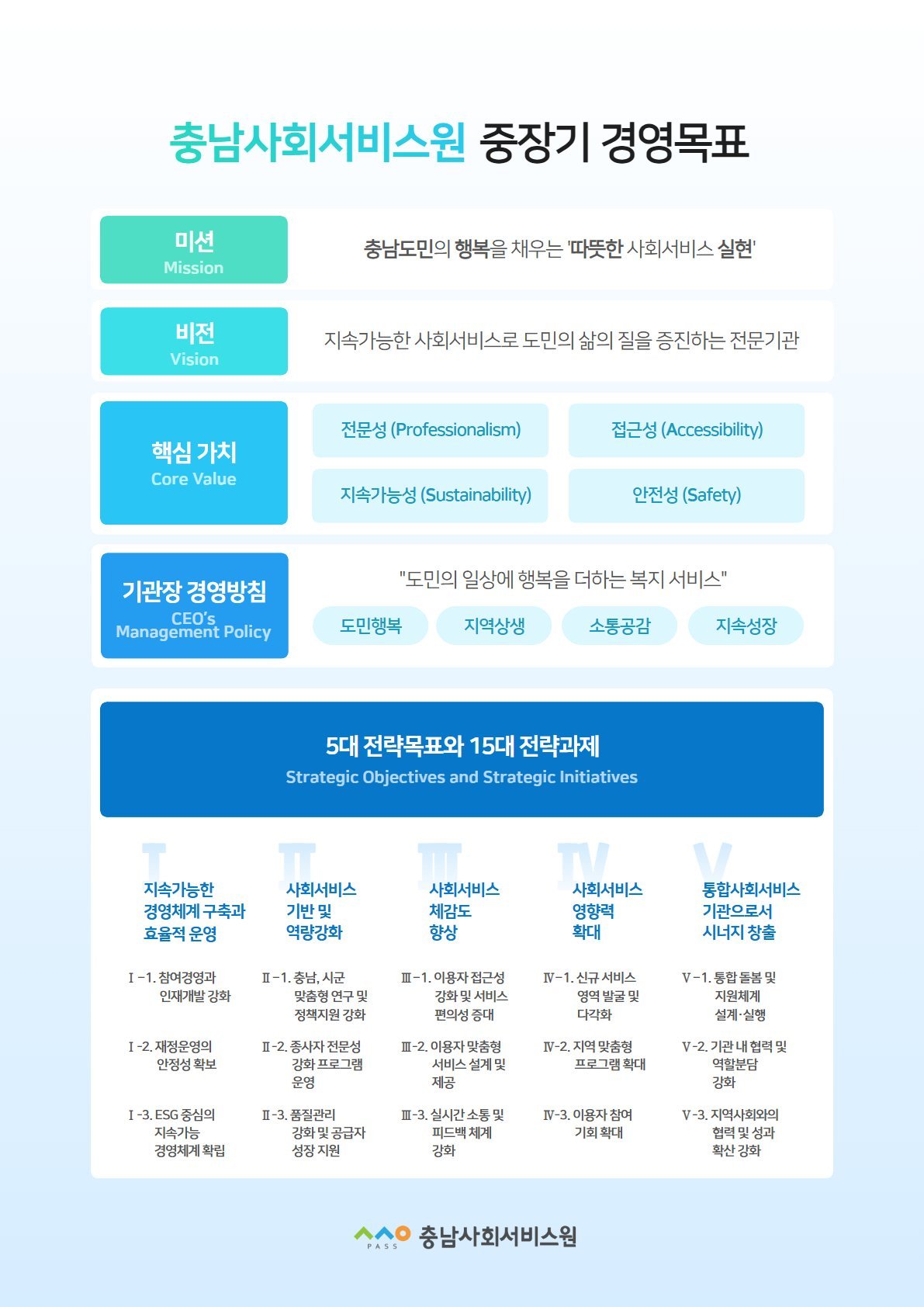 김영옥 원장은 “복지는 제도에 머무는 것이 아니라 도민의 일상에서 체감돼야 한다”며 “현장과 생활에 밀착한 사회서비스 혁신을 통해 충남형 사회서비스 브랜드를 확립하고, 도민 누구도 소외되지 않는 촘촘한 지원체계를 만들어 가겠다”고 말했다. 이어 “도민의 행복을 최우선 가치로 삼아 지역과 함께 성장하는 신뢰받는 공공복지 전문기관으로 도약하겠다”고 강조했다.