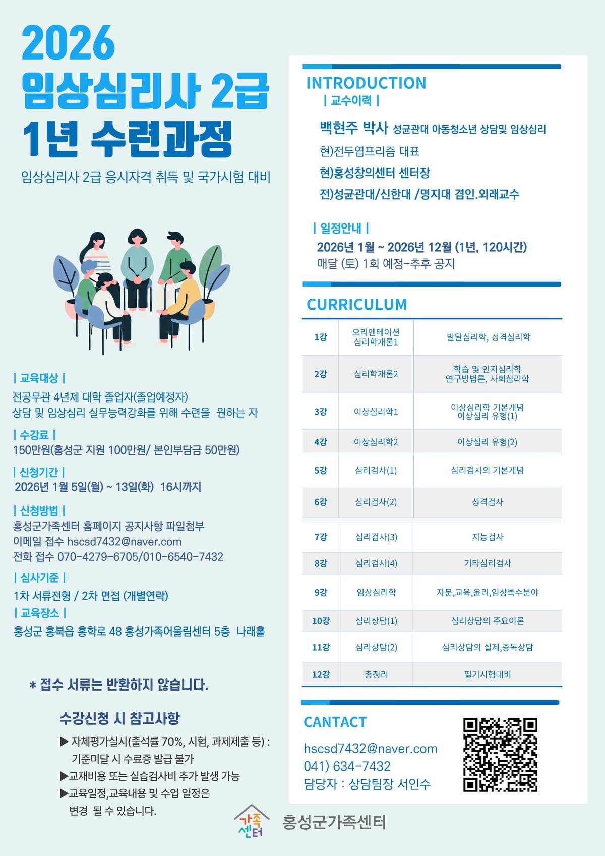 교육과정은 오는 2월부터 12월까지 총 12회기로 매월 셋째주 토요일에 운영할 예정이며, 교육 수료자는 임상심리사 2급 취득 응시자격인 수료증을 받게 된다.