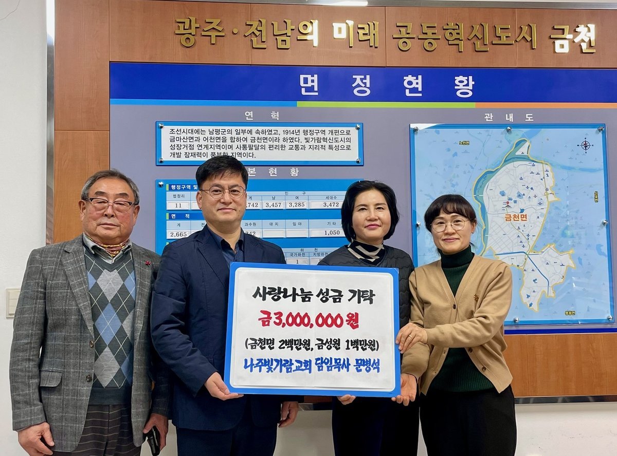 유지영 금천면장은 “매년 변함없이 나눔을 실천해 주신 나주빛가람교회에 깊이 감사드린다”며 “기탁된 성금은 도움이 필요한 이웃들에게 소중히 사용하겠다”고 밝혔다.