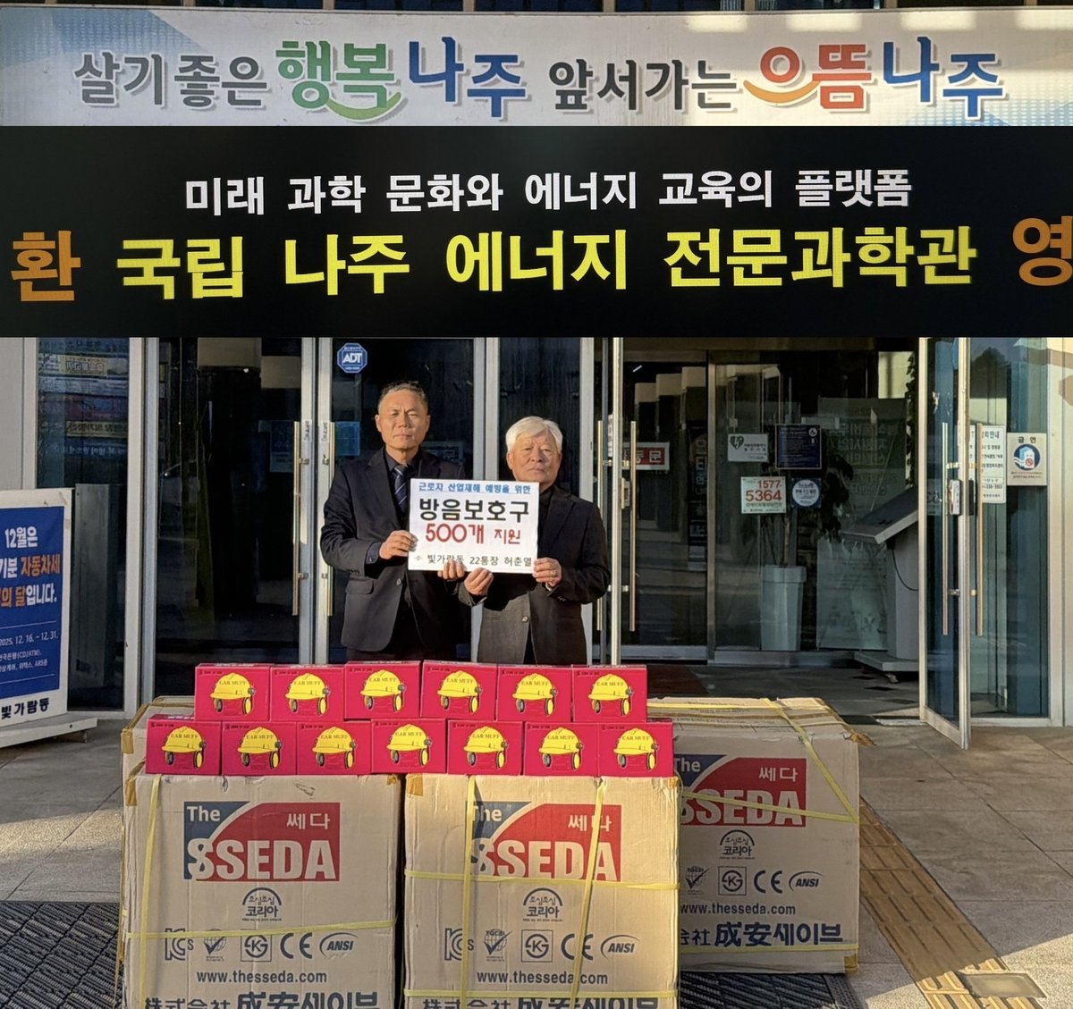 이날 기부된 안전용품은 나주 혁신산단을 비롯한 관내 산업현장에서 근무하는 근로자 500명에게 전달될 예정으로 소음 노출로 인한 산업재해를 예방하고 작업 환경 개선에 실질적인 도움이 될 것으로 기대된다.
