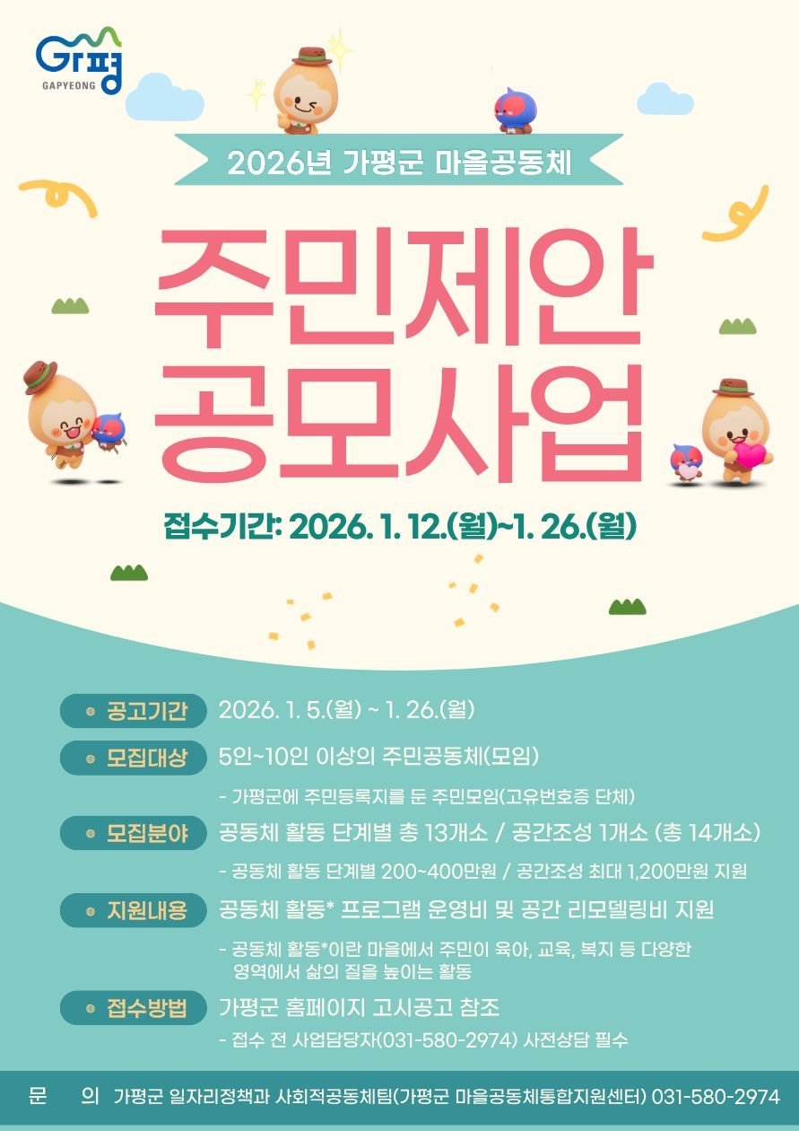 [금요저널] 가평군이 주민 주도의 마을공동체 활성화를 위해 '2026년 가평군 마을공동체 주민제안 공모사업'을 추진한다.