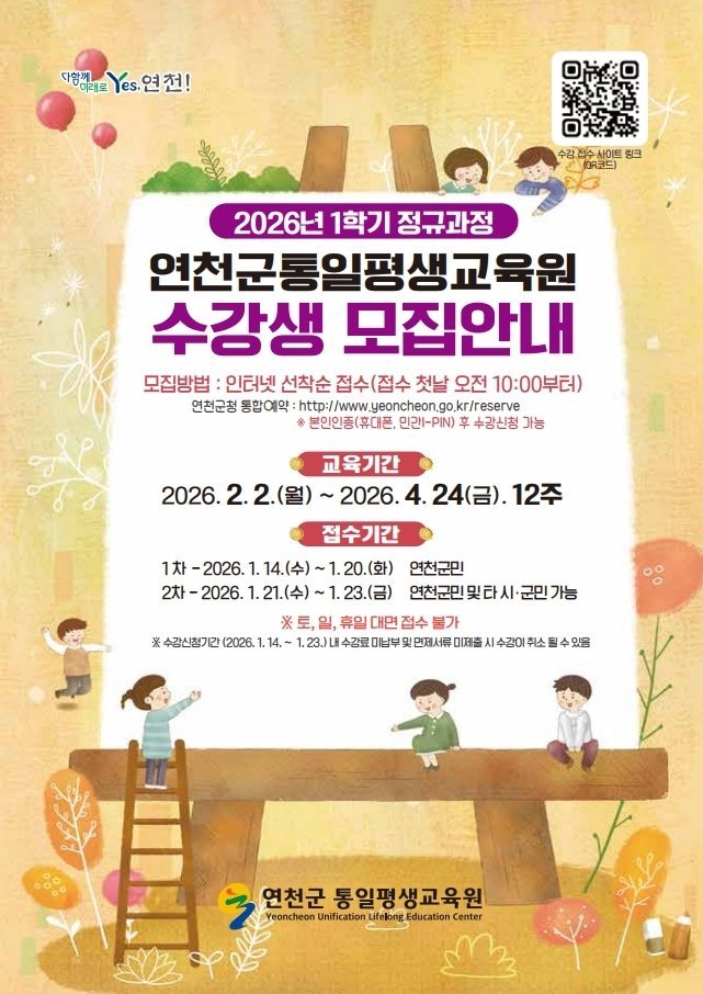 수강 신청은 1월 14일부터 1월 23일까지 진행되며, 연천군청 홈페이지 통합예약 시스템을 통해 온라인으로 신청할 수 있다.