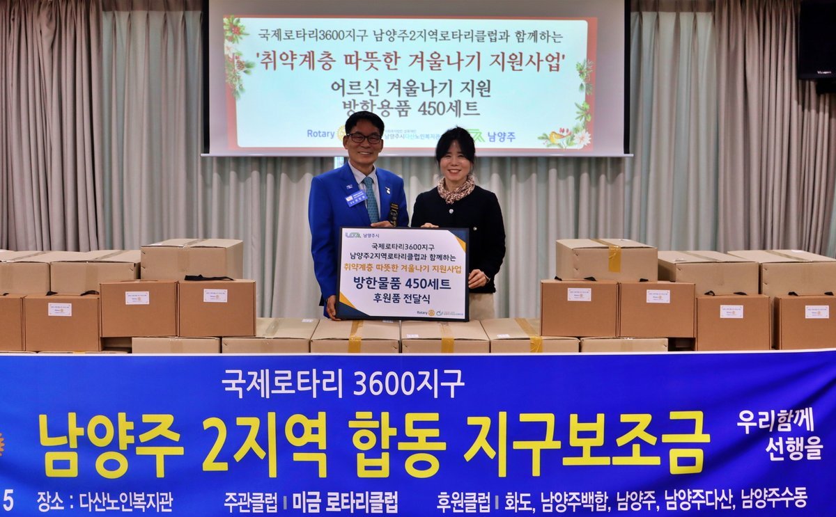 [금요저널] 남양주시는 지난 5일 다산노인복지관이 국제로타리 3600지구 남양주 2지역 로타리클럽과 함께 겨울철 한파에 취약한 취약계층을 위한 후원물품 전달식을 개최했다고 밝혔다.