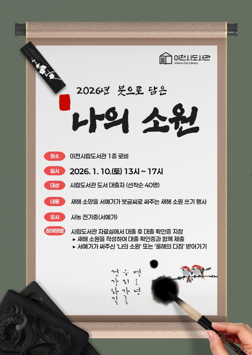 [금요저널] 이천시립도서관은 2026년 병오년 새해를 맞아 시민의 한 해 소망과 다짐을 서예가가 붓글씨로 써주는 「2026년 붓으로 담은 ‘나의 소원’」 행사를 오는 1월 10일 오후 1시부터 5시까지 시립도서관 1층 책마당 로비에서 운영한다.