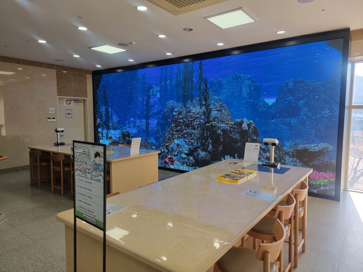 강화에서 발견되는 상괭이, 점박이물범 등 7종 생물을 직접 색칠하면 미디어아트로 표출된다.