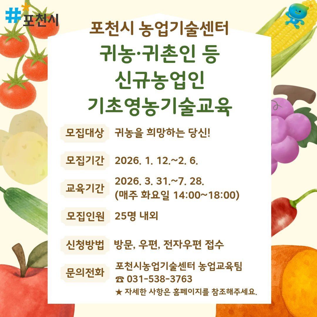 [금요저널] 포천시농업기술센터 2026년 포천시 귀농·귀촌인 등 신규농업인 기초영농기술교육’교육생을 오는 2월 6일까지 모집한다.