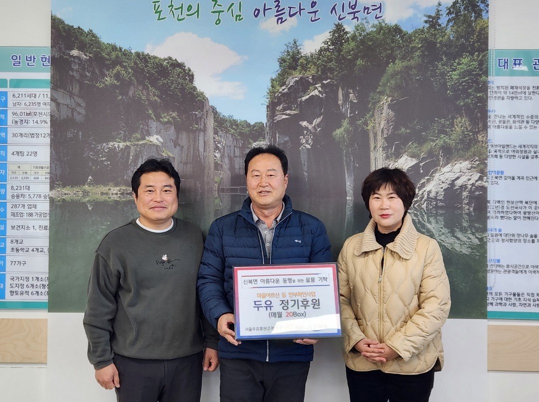 [금요저널] 포천시 신북면 행정복지센터는 서울우유포천고객센터가 관내 취약계층을 위해 매월 두유 20박스를 정기 후원한다고 밝혔다.
