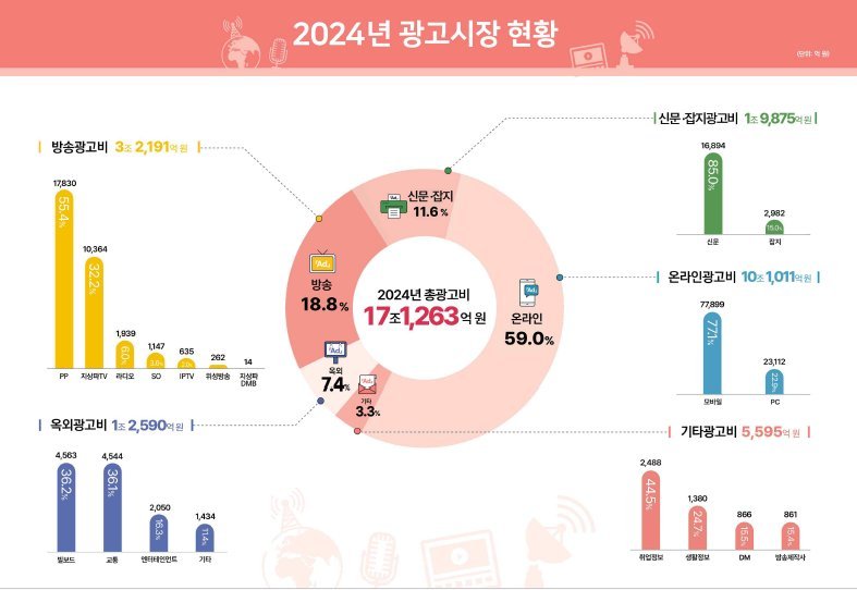 2024년 매체별로 보면 방송 광고비가 3조 2,191억 원으로 전체 광고비의 18.8%를 차지하고 있으며, 온라인 광고비 10조 1,011억 원으로 59.0%, 신문·잡지 광고가 1조 9,875억 원으로 11.6%, 옥외 광고는 1조 2,591억 원으로 7.4%로 집계됐다.