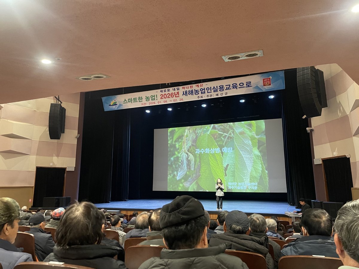 [금요저널] 예산군농업기술센터는 관내 농업인의 역량 강화와 첨단 농업기술 보급을 위해 ‘2026년 새해농업인실용교육’을 1월 8일 사과반을 시작으로 2월 26일까지 실시한다.