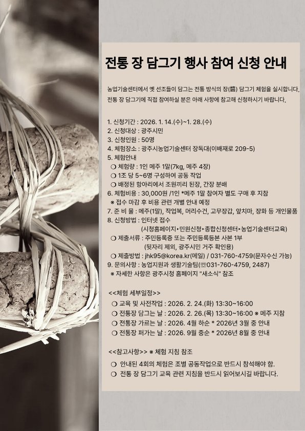 [금요저널] 광주시는 시민들에게 전통 장류의 우수성과 발효식품의 가치를 알리고 손수 장을 담가보는 체험 기회를 제공하기 위해 '2026년 전통 장 담그기 체험'참여자를 모집한다고 9일 밝혔다.