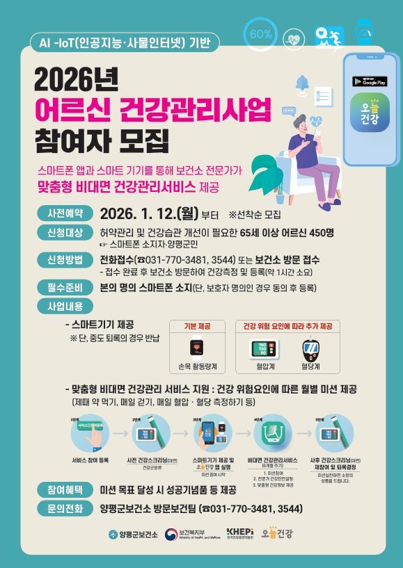 [금요저널] 양평군은 65세 이상 어르신을 대상으로 스마트폰 앱과 스마트 기기를 활용해 보건소 전문가가 비대면 맞춤형 건강관리 서비스를 제공하는 ‘2026년 인공지능·사물인터넷 기반 어르신 건강관리 사업’참여자를 오는 12일부터 모집한다고 밝혔다.