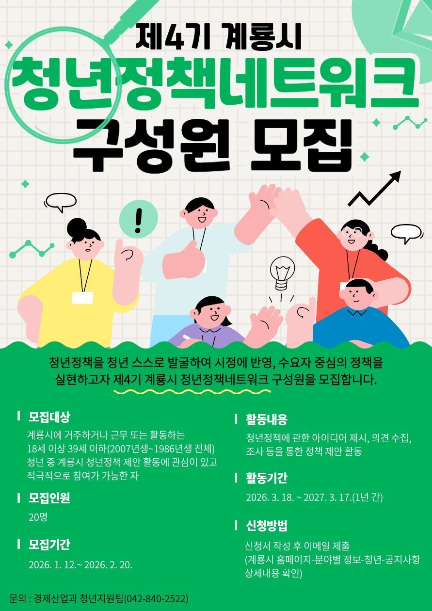 [금요저널] 충남 계룡시는 이달 12일부터 오는 2월 20일까지 제4기 청년정책네트워크에 참여할 지역 청년을 모집한다.