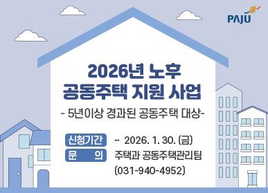 [금요저널] 파주시는 노후 공동주택의 안전성과 주거환경 개선을 위해 ‘2026년 노후 공동주택 시설물 보수 및 소규모 공동주택 유지관리 지원 사업’과 함께 ‘청소노동자 휴게시설 신청 지원 사업’을 추진한다고 밝혔다.
