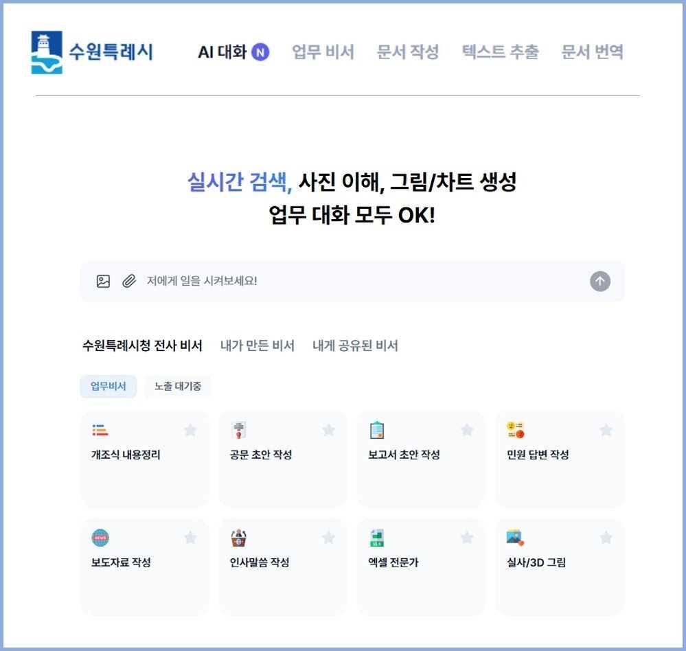 이재준 수원시장은 “인공지능 업무 비서 서비스 도입으로 수동‧반복적인 행정 업무 수행 방식을 개선하고, 인공지능을 활용한 스마트 행정 환경을 조성할 것”이라며 “행정 전반에 인공지능 활용을 확산해 공직자들이 창의적이고 가치 있는 업무에 집중할 수 있는 업무 환경을 만들어 가겠다”고 밝혔다.