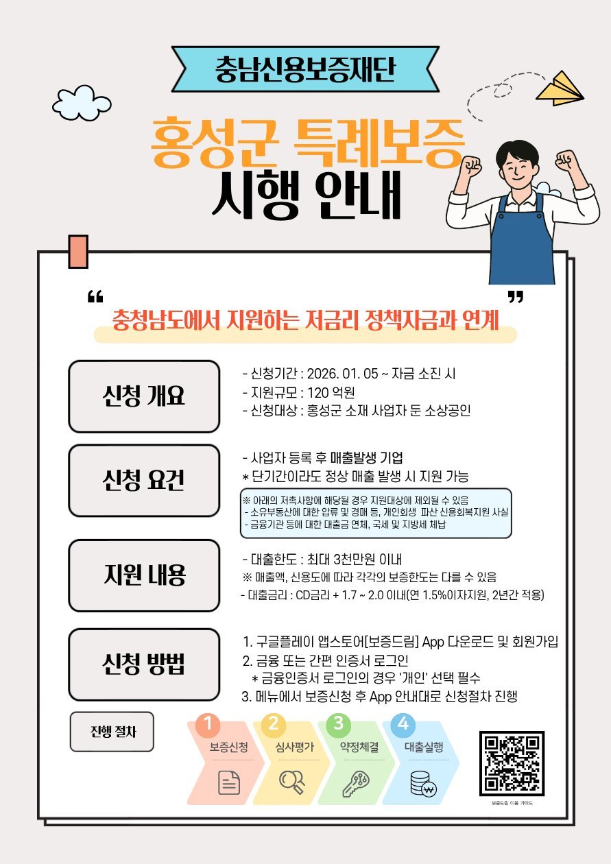 신청 대상은 홍성군에 사업장을 두고 영업 중인 소상공인이며, 업체당 보증 한도는 최대 3천만 원 이내이다.