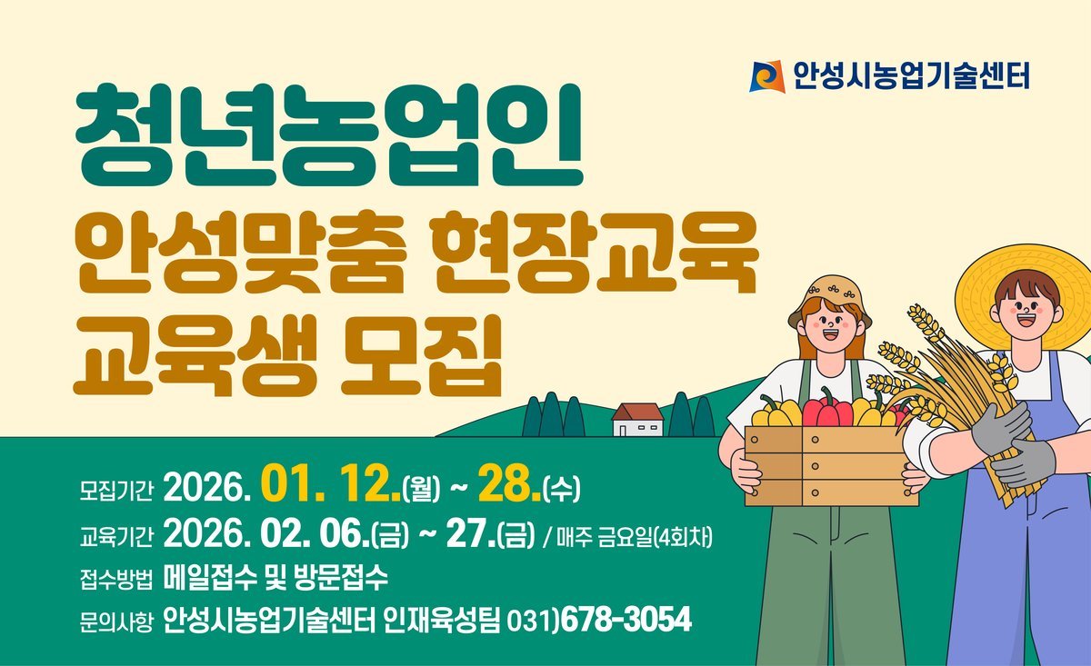 모집 기간은 1월 12일부터 28일까지이며 모집 인원은 15명으로, 안성시 청년농업인과 창농을 희망하는 만 18세 이상 40세 미만 청년을 대상으로 한다.