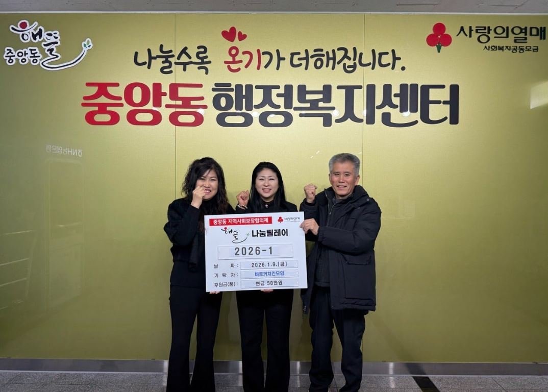 백경희 중앙동장은 “새해의 시작과 함께 어려운 이웃을 먼저 생각해주신 바로커치킨 모임에 감사드린다”며 “이번 첫 나눔이 마중물이 되어 더 많은 기부와 참여로 이어질 수 있도록 중앙동에서도 촘촘한 복지 실현에 힘쓰겠다”고 밝혔다.