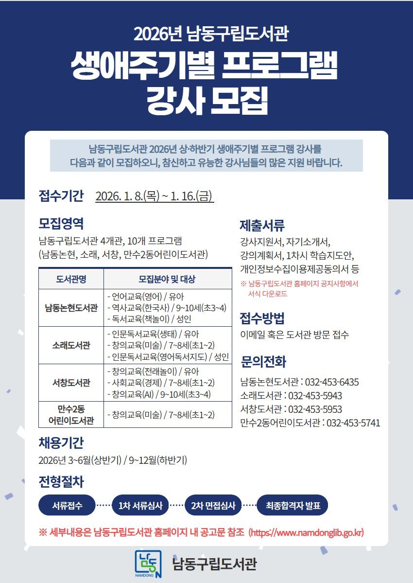 [금요저널] 인천시 남동구 구립도서관은 3~12월까지 운영하는 ‘2026년 상·하반기 생애주기별 프로그램’에 함께 할 프로그램 강사를 공개 모집한다고 12일 밝혔다.