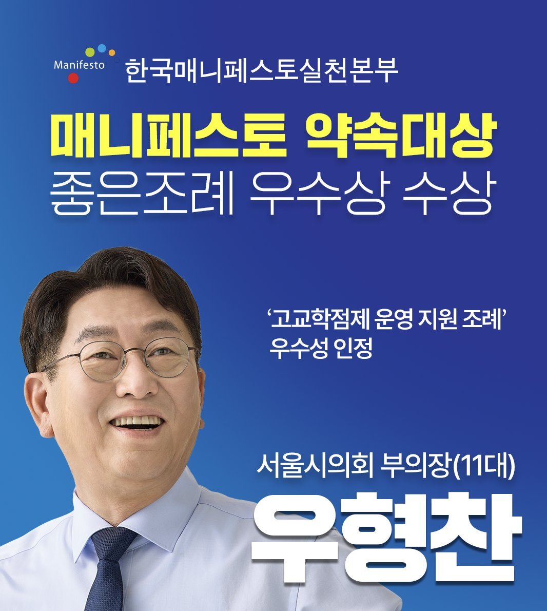 우형찬 서울시의원, 매니페스토 '약속대상'좋은조례 우수상… 고교학점제 혼란 줄일 기반 인정